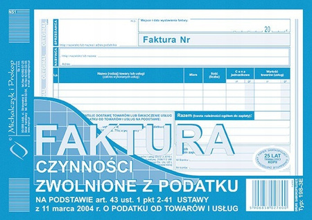 - Bloczek faktur 198-3E A5 to druk samokopiujący (oryginał + kopia) 80 kartek, przeznaczony do wystawiania faktur za czynności zwolnione z VAT. Poręczny format A5 i czytelny układ sprawiają, że idealnie sprawdza się w biurze i małych firmach.