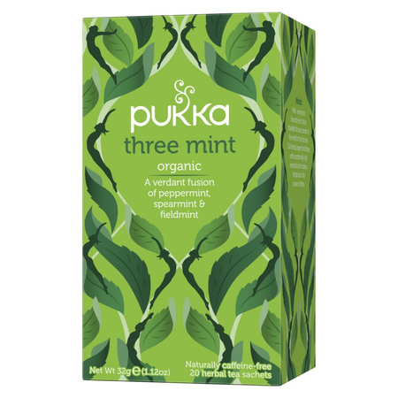 - Herbata Pukka Three Mint łączy miętę pieprzową, zieloną i polną z ekologicznych upraw. Bez kofeiny, idealna na każdą porę dnia, orzeźwia i wspiera trawienie. 20 kopert dla pełnej świeżości i aromatu.